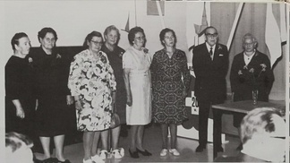 ![]() Yhdistyksen perustajajäseniä: Fanny Sainio, Martta Kaimer, Katri Ranta, Fanny Askolin, Aila Eertamo, Jenny Grönberg, Harald Havas ja Elin Sundvik |